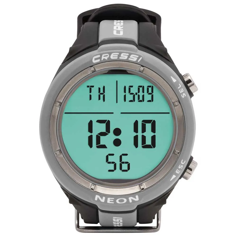Bearing the Cressi Specialized standard seal, Neon displays a more sporty, modern appearance than previous computers of the brand while maintaining a tendency to be less heavy and more hydrodynamic. With a extra-flat profile of just 14 millimeters and 70 grams, the Neon will never be an underwater nuisance. However, its low profile has not made it lose any quality in safety and protection: its anti-scratch mineral glass has the additional barrier of a Crystal silicone protector to further reduce the risk of breakage and accidents.